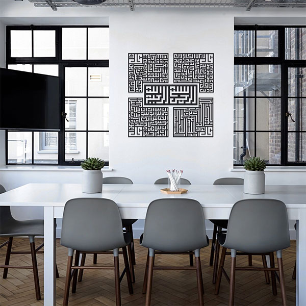 Transform your living space or prayer area with this stunning piece of Islamic calligraphy, meticulously crafted for both spiritual significance and lasting beauty. Our Four Qulls Kufic (5Pcs.) metal wall art is not just decor; it is a timeless affirmation of faith rendered in durable, modern design.